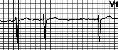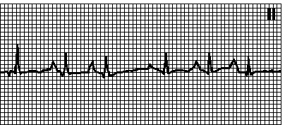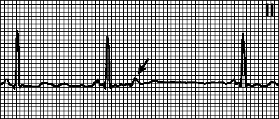 2. Блокированные предсердные экстрасистолы. Внеочередной несинусовый зубец P, за которым не следует комплекс QRS. Через АВ-узел, находящийся в периоде рефрактерности, предсердная экстрасистола не проводится. Экстрасистолический зубец P иногда наслаивается на зубец T, и распознать его трудно; в этих случаях блокированную предсердную экстрасистолу ошибочно принимают за синоатриальную блокаду или остановку синусового узла.